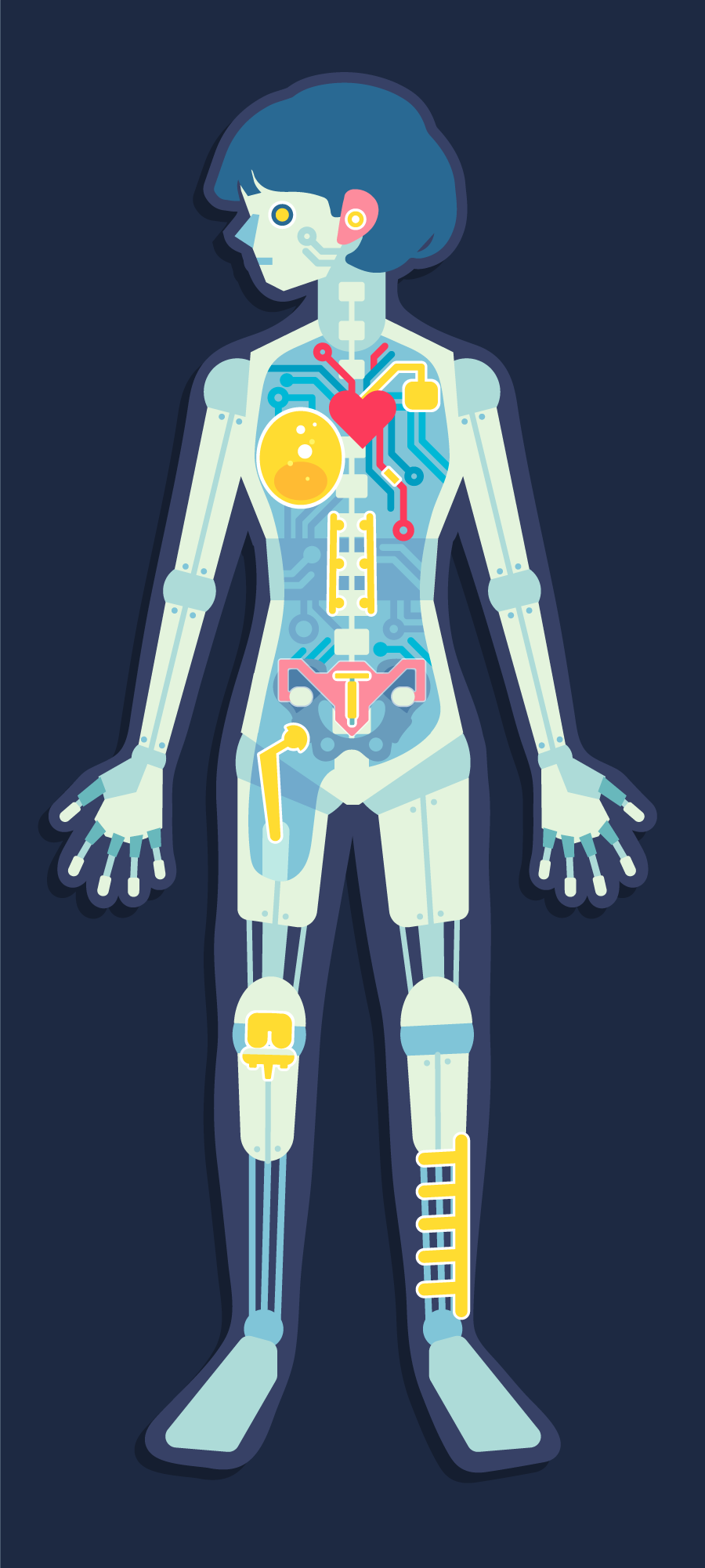 Ranging from artificial eye lenses and heart defibrillators to artificial knees and breast implants, a wide variety of artificial technology has been and is still being implanted into the human body.